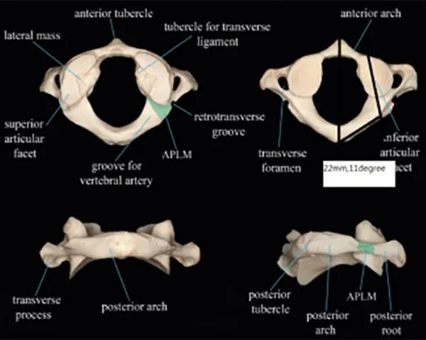寰椎由前弓和后弓连接两个侧块构成。在椎动脉沟的下方和外侧,为后弓最薄部分,位于侧块的后方,称为侧块后弓arch posterior to the lateral mass(APLM)。APLM是后弓侧块螺钉的理想入钉点处,侧块螺钉的理想入钉点位于下方。一些患者,寰椎横突孔后存在一个开放或封闭的椭圆形副孔,有时仅为凹陷,成为横突后孔或沟,沟内有吻合静脉,连接上方枕下海绵窦和寰椎后弓下方的静脉窦。环椎外侧肿块内侧壁距中线10.2 mm (8.9-12.8 mm)。枢椎椎体到齿突基部的高度为22.13 mm (17 26 mm)。齿高15.8 mm (9 21 mm),冠状面平均宽度10.8 mm,矢状面平均宽度10.9 mm。相对于椎体齿突后倾斜0-30度。